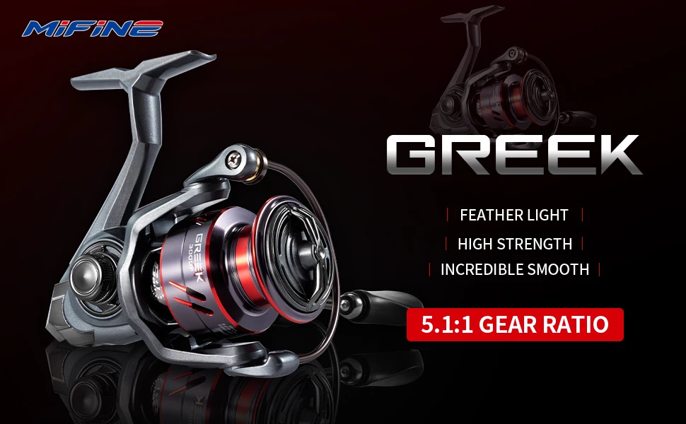 HIGH STRENGTH & POWER – The Mifine Greek spinning reel offers outstanding performance across all spinning applications. Its carbon-infused nylon frame reduces overall weight while enhancing strength. A 5.1:1 high-speed gear ratio improves efficiency, delivering a powerful and enjoyable fishing experience. With its unique design and reliable performance, the Greek reel is built to impress.