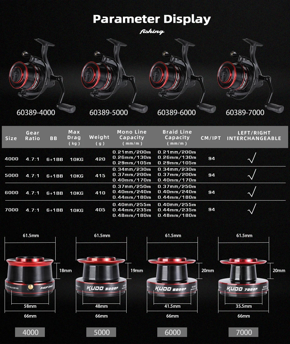 ● Functionality: KUDO has four different spools for its four sizes, which size 4000 has a shallow Spool, size 5000 and 6000 have moderate deep spools, and size 7000 has a deep spool. Anglers can choose different sizes to meet their fishing needs.